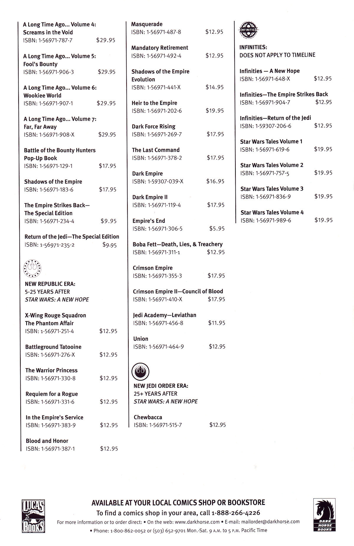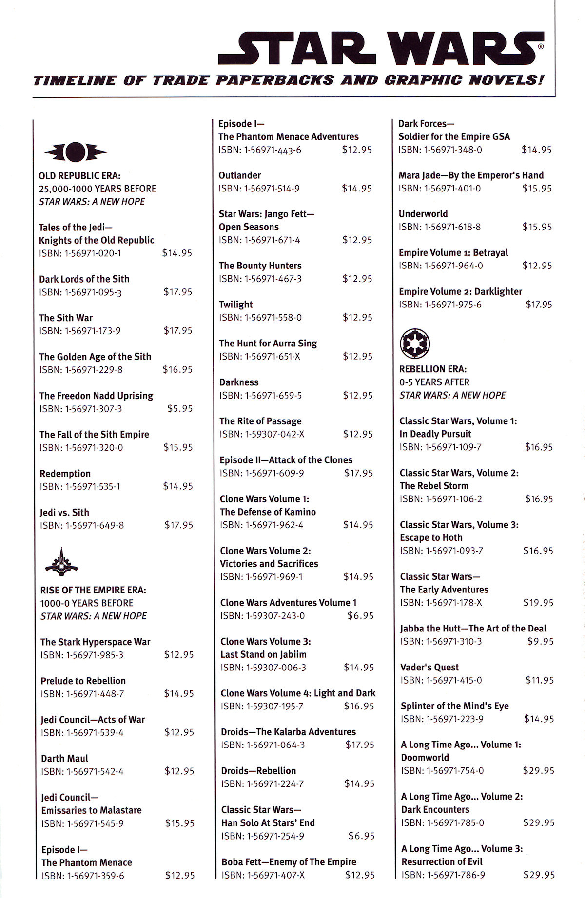 0 == SW4 == Star Wars Episode 4: A New Hope (SW4) == Battle of Yavin (BoY). M == multiple timelines; ? = unknown timelines. 0+ | 3d ! | 1-3 M | adventures/forces_of_destiny = | hera; leia; rey M | adventures/v2009 ! | 1-6 M | adventures/v2017 = | 1-6; ashcan 0+ | annual ! | 1979,1982-1983,1999,2016 25+ | chewbacca/v2000 ! | 1-4 1+ | chewbacca/v2015 ! | 1-5 0+ | classic/at_stars_end ! | 1-3 19- | dark_times ! | 1-17 19- | dark_times/a_spark_remains ! | 1-5 19- | dark_times/fire_carrier ! | 1-4 19- | dark_times/out_of_the_wilderness ! | 1-5 33- | darth/maul ! | 1-4 22- | darth/maul/son_of_dathomir ! | 1-4 M | darth/vader/annual ! | 2016 19- | darth/vader/cry_of_shadows ! | 1-5 0 | darth/vader/down ! | 1 M | darth/vader/etc ! | goodnight 19- | darth/vader/ghost_prison ! | 1-5 19- | darth/vader/lost_command ! | 1-5 19- | darth/vader/ninth_assassin ! | 1-5 0 | darth/vader/quest ! | 1-4 0 | darth/vader/v2015 = | 1-20 0 | doctor_aphra/annual = | 2017 0 | doctor_aphra/v1 = | 1-13 0+ | droids/etc ! | c-3po; kellog; special M | etc ! | adventures_beggars_canyon; another_universe_exclusive; sergio_aragones_stomps; tales_from_mos_eisley; vaders_little_princess; valentine_story; visionaries M | etc/fbcd = | 2002,2005-2006,2015 22- | fetts/blood_ties ! | 1-8 0-5 | fetts/boba/enemy_of_the_empire ! | 1-5 M | fetts/boba/etc ! | agent_of_doom; death_lies_treachery; man_with_a_mission; open_seasons; overkill; salvage; twin_engines_of_destruction M | fetts/jango/etc ! | jango_fett 56- | fetts/jango/open_seasons ! | 1-4 4 | jabba ! | art_of_the_deal; betrayal; dynasty_trap; gaar_suppoon_hit; hunger_of_princess_nampi; jabba_tape 33- | jedi/council/acts_of_war ! | 1-4 53- | jedi/dark_side ! | 1-5 36453- | jedi/dawn/force_storm ! | 0-5 36453- | jedi/dawn/force_war ! | 1-5 36453- | jedi/dawn/prisoner_of_bogan ! | 1-4 0 | jedi/kanan = | 1-11 22 | jedi/obi_wan_anakin ! | 1-5 22-20 | jedi/people ! | aayla_secura; count_dooku; mace windu; shaak_ti; yoda 28- | jedi/quest ! | 1-4 37- | jedi/qui_gon_obi_wan/autoorient_express ! | 1-2 37- | jedi/qui_gon_obi_wan/last_stand_ord_mantel! | 1-3 5000-3986 | jedi/tales/golden_age_of_the_sith ! | 0-5 5000-3986 | jedi/tales/dark_lords_of_the_sith ! | 1-6 5000-3986 | jedi/tales | redemption 1-5; the_fall_of_the_sith_empire 1-5; the_freedon_nadd_uprising 1-2; the_sith_wars 1-5 1000- | jedi/vs_sith ! | 1-6 19- | lando/v2015 ! | 1-5 0+ | leia/princess ! | 1-5 140+ | legacy/v1 ! | 0-50; 0. 5 140+ | legacy/v2 ! | 1-18 140+ | legacy/war ! | 1-6 0+ | rebel_heist ! | 1-4 0+ | river_of_chaos ! | 1-4 6+ | shattered_empire ! | 1-4 0+ | solo/han ! | 1-5 0+ | the ! | 0-8 0+ | v1 ! | 1-107 0+ | v2 ! | 1-20 0+ | v3 = | 1-32 0+ | classic | 1-20; devil's world 1-2; the early adventures 1-9; the_vandelhelm_mission 3964- | knights_of_the_old_republic | 0-50 3632- | the_old_republic | main 1-6; the_lost_suns 1-5; blood_of_the_empire 1-3; threat_of_peace 1-3 1032- | knight_errant | preview 0; aflame 1-5; deluge 1-5; escape 1-5 32- | movies/1_the_phantom_menace | 0-1; adventures 1-4 22- | movies/2_attack_of_the_clones | 1 19- | movies/3_revenge_of_the_sith | 1 0 | movies/4_a_new_hope | contemporary_motivators; special_edition; storybook; toyopop 0 | movies/rogue_one ! | 1-6; cassian_k2so 3 | movies/5_the_empire_strikes_back | special_edition; toykopop 4 | movies/6_return_of_the_jedi | special_edition; tokyopop 45 | movies/7_the_force_awakens ! | 1-6 32-0 | star_wars/republic | 1-83; heart_of_fire 24- | starfighter | crossbones 1-3 23- | zam_wesell | 1-4 22- | clone_wars | 1-9 22- | clone_wars_adventures | 1-10 22- | hasbro | most_precious_weapon 1-4 22- | the_clone_wars | free; 1-12; volume 1-6 22- | the_clone_wars_webcomic | 1-26 20- | general_grievous | 1-4 20- | obsession | 1-5 19- | hyperspace | a_hunters_fate; darth_vader_strikes; evasive_action 1-3; podracing_tales; rookies 1-2; wookie_world 19- | purge | 1; seconds_to_die; the_hidden_blade; the_tyrants_fist 1-2 5-10 | droids | 1-6; rebellion 1-4; season_of_revolt 1-4; the_protocol_offensive 3- | agent_of_the_empire | iron_eclipse 1-5; hard_targets 1-5 2- | the_force_unleashed | 1-2 0- | underworld | 1-5 0 | jawa_force | 1-5 0 | empire | 1-40; tpb 4-5 0 | rebellion | 0-16 0+ | marvel | classic 1-3; droids 1-8; ewoks 1-; illustrated 1-4; omnibus 1-5; return_of_the_jedi 1-4 0+ | strip | 1-16 0+ | splinter_of_the_minds_eye | 1 0+ | tag_and_bink | are_dead 1-2; vol2 1-2 3 | shadow_stalker | 1 3+ | shadows_of_the_empire | 1 4 | shadows_of_the_empire/evolution | 1 4 | mara_jade/by_the_emperors_hand | 1 4+ | x-wing_rogue_squadron | 1-35; handbook; kellog; rogue_leader 1-3 9+ | the_thrawn_trilogy | 1-3 10+ | dark_empire | 1-2 11 | empires_end | 1-2 11+ | crimson_empire | 1-3; hard_currency 13+ | jedi_academy | leviathan 1 20+ | union | 1-4 25+ | invasion | 0-12; revelations 1-5 M | bounty_hunters | aurra_sing |32-|; kenix kil |11|; scoundrels_wages |3.5|; the_battle_of |3.5|; twin_engines_of_destruction |5+| M | handbook | crimson_empire; dark_empire; knights_of_the_old_republic M | infinities | a_new_hope; the_empire_strikes_back; return_of_the_jedi M | tales | 1-25 M | vector | 1 1- | etc/this_crumb_for_hire | 1 0 | etc/lego | 1 0+ | etc/dark_forces | 1 0+ | etc/soulcalibur_visions_of_the_blade | 1 0+ | etc/the_constancia_affair | 1 M | manga | movies 1,4-6; perfect_evil M | etc/etc | cross_sections/dictionary/essentials/gamer/insider/magazines/maps M | etc/the_films_and_the_galaxy_beyond | 1
