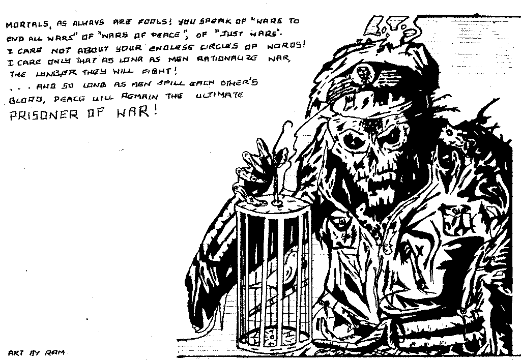 I drew this picture from memory (a series of dreams, actually) around 1985, along with a series of other pictures juxtaposing the death/war figure in different paradoxical Orwellian contexts. I recall seeing key portions somewhere but am not sure where. I'll scan the other images and put them up as I find time.