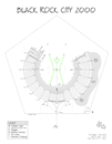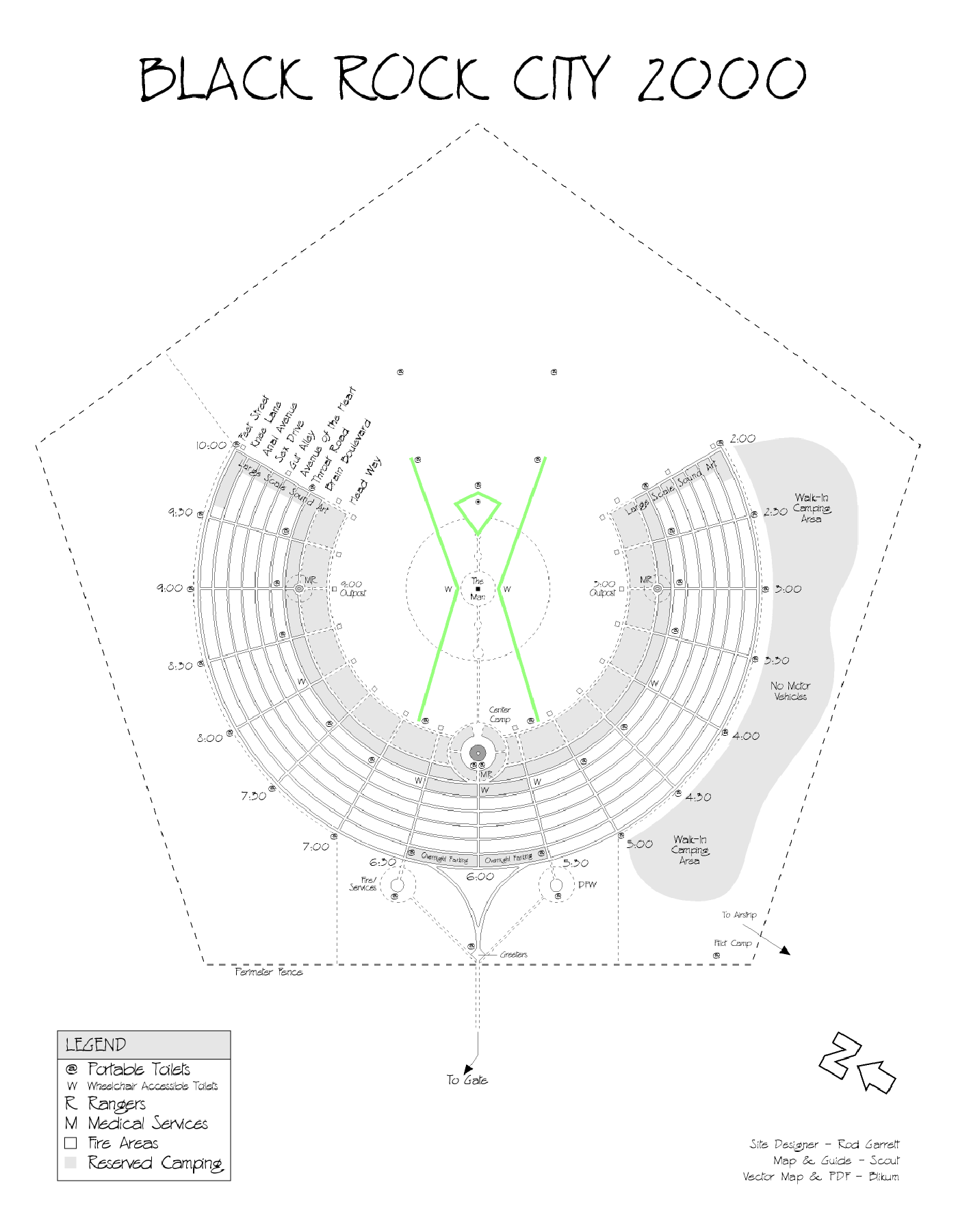This year, the theme at Burning Man was the body which translated into the city being constructed in a unique manner that reflected the human image: the general shape of the village was that of a horse shoe and at the center of the open end was the neon-lit wooden effigy that was to be burnt (the Man). The horse shoe area was divided into parallel streets that traced the curve that (in order) comprised the body parts: Feet Street, Knee Lane, Anal Avenue, Sex Drive, Gut Alley, Avenue of the Heart, Throat Road, Brain Boulevard, and Head Way. The inner most ring was the Esplanade. Running across these streets were half-hour divisions starting from 2:00 to 10:00. We stayed around 9:30 Sex Drive.