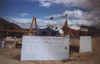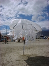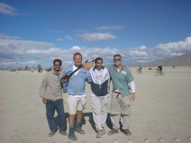 Our trip started on Thursday, August 31st, after I had finished making a whole bunch of predictions for the fourth meeting on the Critical Assessment of Protein Structure Prediction while averaging two hours of sleep per day for the last two weeks. I, along with my friends Jason (who took a few of the pictures here), Bagus and Crash, headed out to Black Rock City in Nevada in a conversion van loaded with enough food and water, shelter and musical equipment, and a generator to enable us to survive for four days in the desert. The journey was uneventful and we arrived at our camp site around midnight, which we christened as the Where the Hell is Frank Free Music camp (a combination of our musical philosophies and the search for a missing friend). We created a tent-like structure using a parachute dome as canopy and set up all our gear.