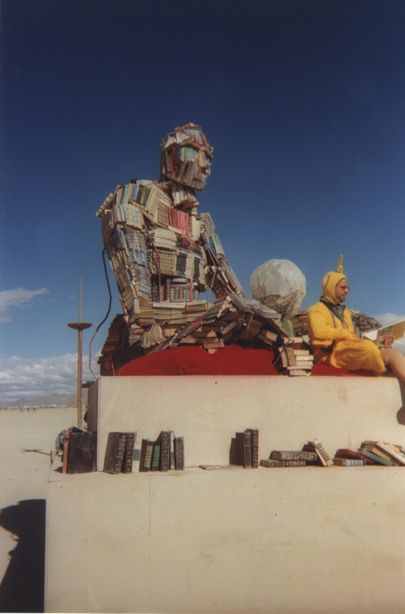 After we finished unpacking, we headed out to the Promenade where the Man was situated. The Man was placed in the centre (solar plexus) of a giant horizontal body laid out in green laser beams thirty feet above the playa in the shape of the Burning Man logo. Circling the man were running super bright LED lights which could be controlled by anyone. Laid out along the body were incredible works of art: Body of Knowledge by Dana Albanya depicting a human figure sculpted from books was extremely creative. Faces of Man by Dan Das Mann where three enormous copper, drift wood and grass heads would cry fire, water, and sand to music was one of the coolest pieces, especially along the copper face where gasoline would pour out of the eyes and catch on fire. During the day, the same copper face would have burn stains that gave the impression that it had been crying. An excellent piece of work. Also brilliant was Dr. Megavolt and the Eyes of the Man by Austin Richards where two twin Tesla Coils would emit thousands of volts of electricity and be absorbed by a figure in a suit standing between them. Other interesting art works included the Flaming Metal Dragon by Lisa Nigro which was a mobile fire-breathing dragon; the Anus by David Normal and Max Hunter where you go through the orifice and exit by sliding out; Phallus of the Man and Yoni Gate by Pepe Ozan which featured giant phallic symbols; The Golden Tower by Susan Robb which was collection of urine samples; and Fire in the Belly by Susan Glover which hosted fire performers doing amazing things (this was seen throughout the festival).
