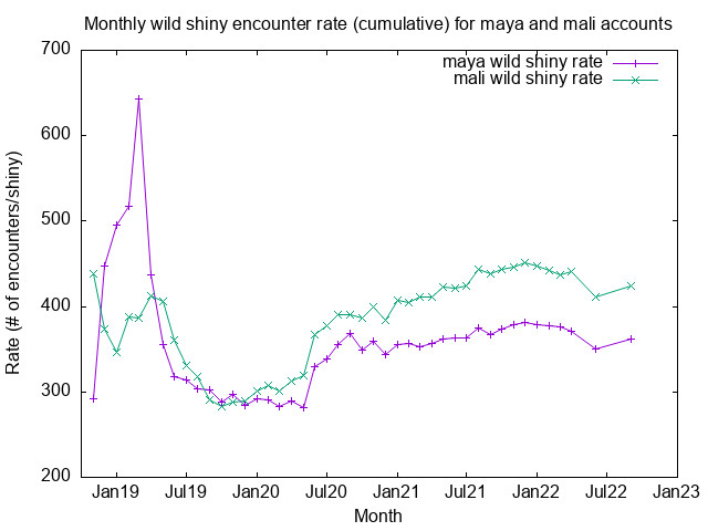 This is the output of my wild shiny eligible encounter log script since November 16, 2018, as well as a record of all shinies encountered since that date. The first three lines are the summaries for two accounts labelled "maya" and "mali". I've only kept careful track of the encounters for "maya" but it's a reasonable assumption that second account (used by my daughter) is nearly identical.