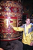 In any event, with my reasons for being against religion just reaffirmed, we wandered back to our car and stopped at Swayambhunath, which is a Buddhist temple with a huge stupa. A number of prayer wheels are placed around the central stupa, which one can spin as they circumambulate. Each wheel contains the sacred mantra om mani padme hum used by Buddhists and Hindus to medidate. The stupa's white base represents the four elements, and the thirteen concentric circles symbolise the 13 degrees of knowledge and the 13 steps that must be taken towards nirvana (represented by the umbrella on the top of the stupa). The temple also contains huge prayer wheels (where we acted like the tourists that we were) and a statue of Avalokiteshvara (the Bodhisattva of our era).