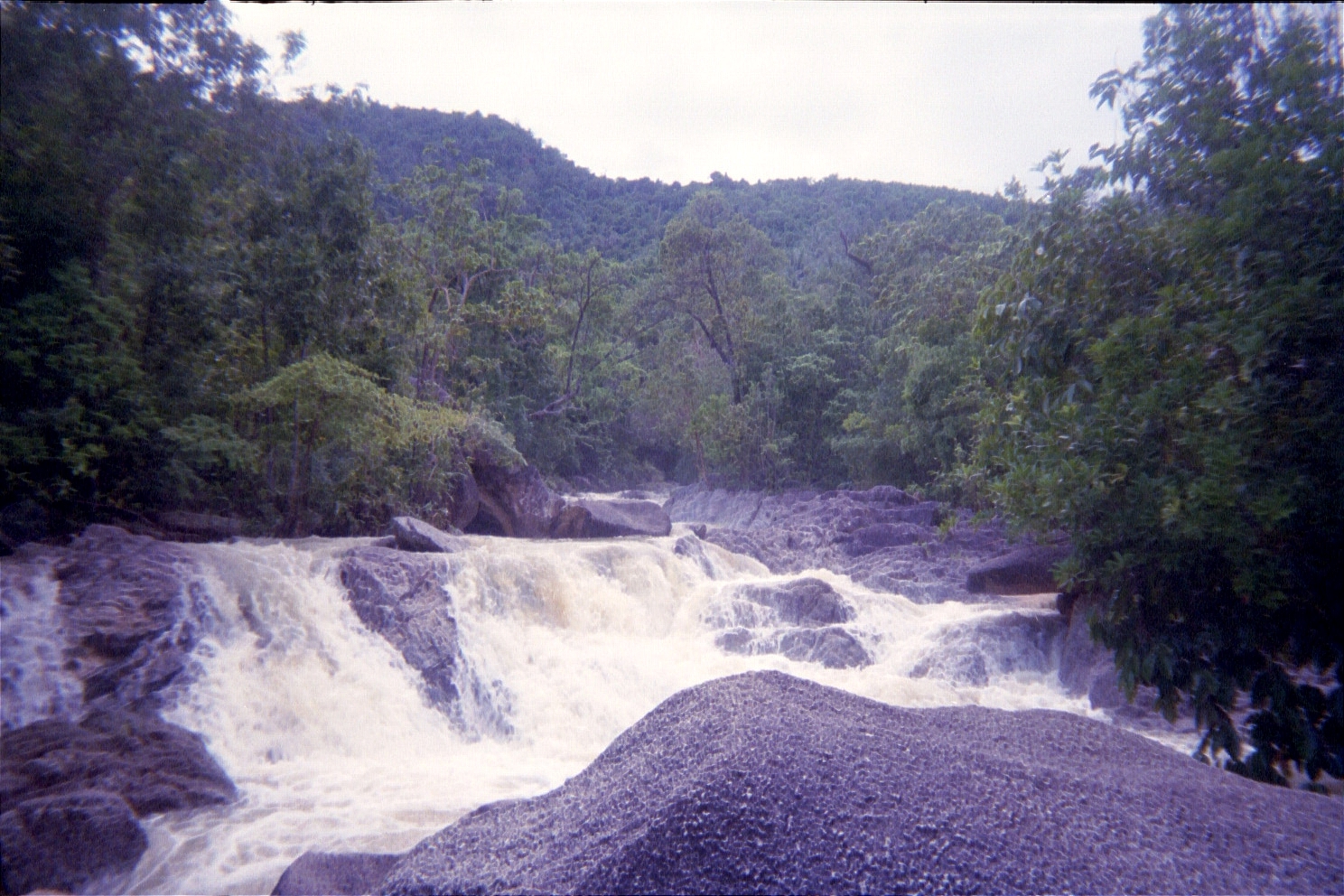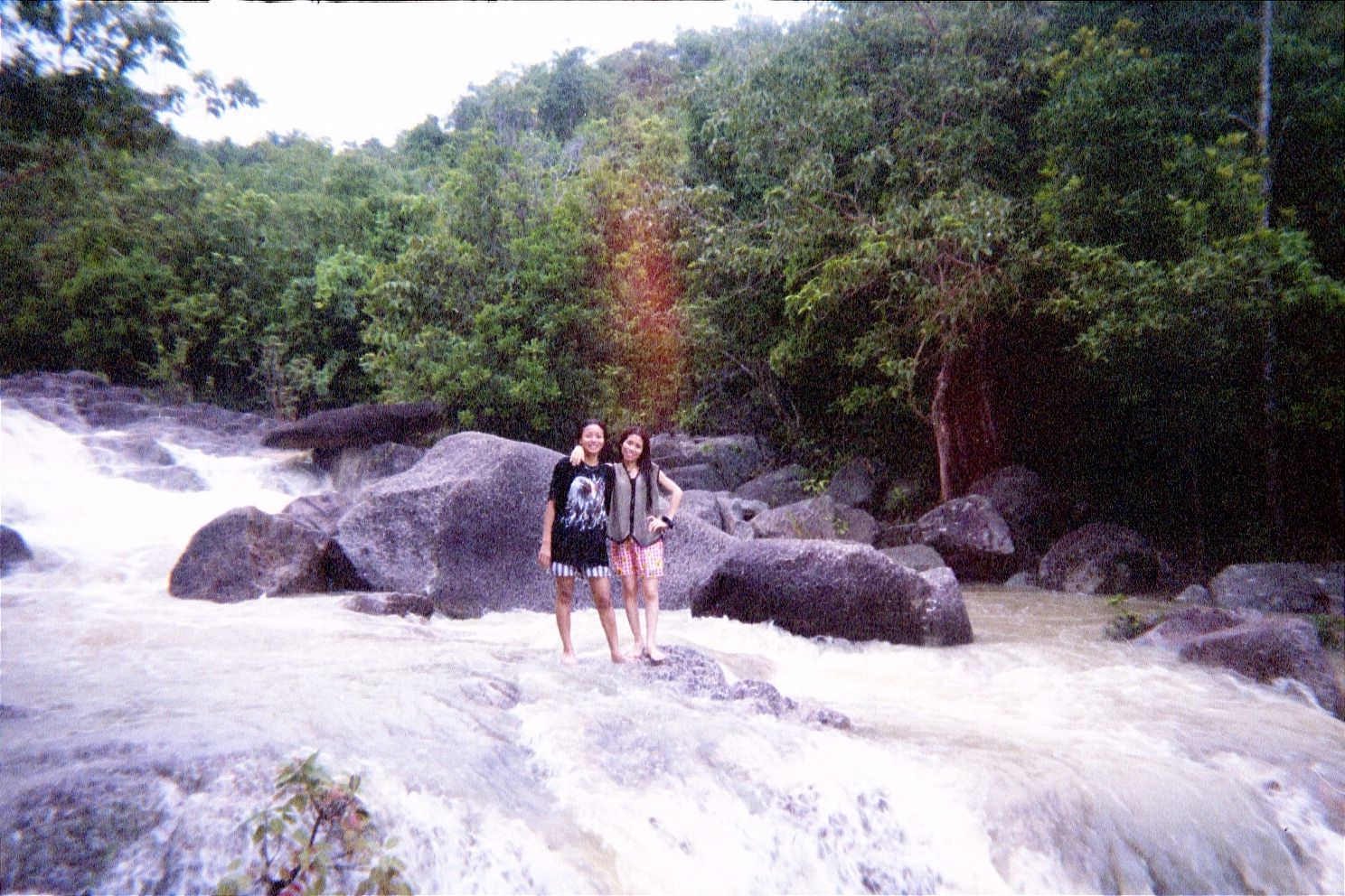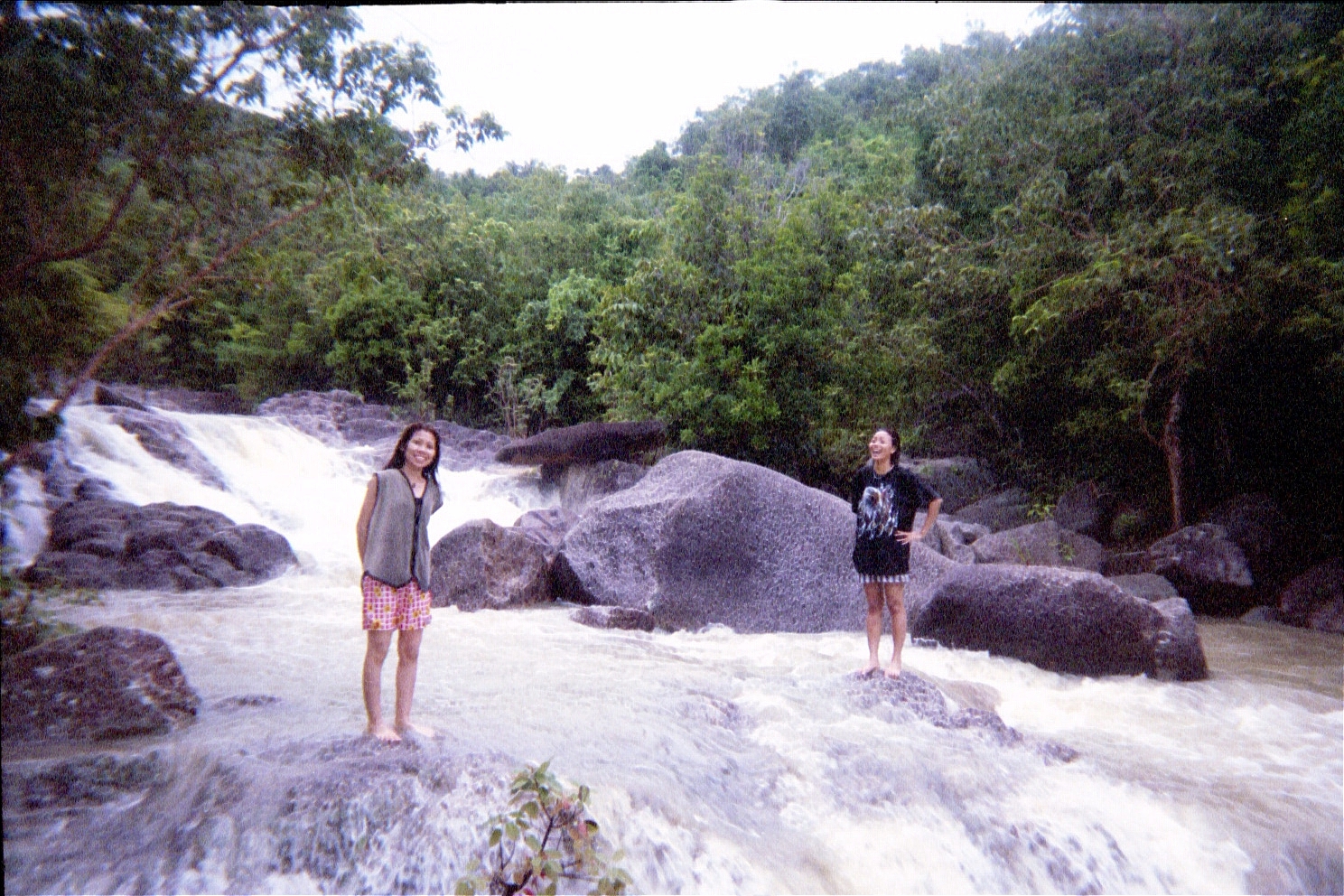December 15. Ko Phangan is an incredibly relaxing place. The next morning, it was raining heavily and so we slept in, had a late breakfast, and again just mellowed out. Eventually by late afternoon we got a bit antsy and decided to hike to a nearby waterfall. We got there and had to cross the fall to hike higher. After playing around a bit (that's Mali laughing at P'Ram being wary of crossing), we slowly started to cross when Mali (who was ahead of us) suddenly disappeared from view, crashing down at least two levels of the waterfall. Fortunately she went down in a way that didn't cause her too much damage and when I finally went to where she was, she was stunned but okay with a few bruises.