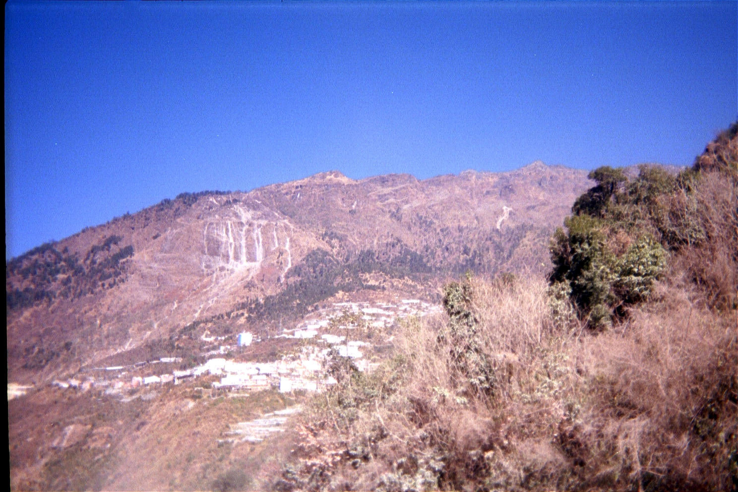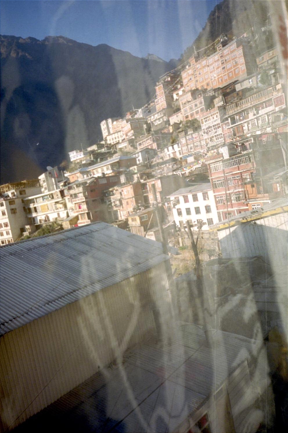 I remarked this to Jason (not being too discreet about it) and the third official realised what I was saying and asked to see our passports again. After a little bit of grilling, we were off on our way to Zhang Mu (2300 metres/7590 feet), stopping for a couple of hours and jamming out on the road since it was closed due to a rockfall. The drive was a steep climb, gaining over 1000 metres/3300 feet or so and offered some spectacular vistas. Finally we could see the mountain-side city looming in the distance.