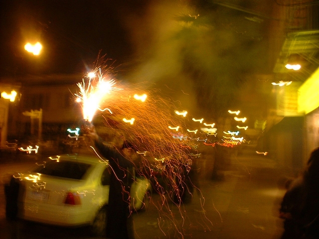 Finally, as dusk settled in, we (now including Bagus, Crash, and Raj) decided to drive up the hills of Millbrae to find a good spot to set off the fireworks. Failing to do so, we then headed out to Twin Peaks. After watching a bit (with emphasis, given the fog) of fireworks across the horizon in Berkeley, Oakland, and San Francisco, and struggling to light our own in the nippy wind, we headed down to Mission. We walked up and down Mission street, setting off an assortment of fireworks on the foot path and the street, including smoke balls of different colours, spinners, sparklers, fountains and cones. None of them were the aerial or the explosive kind (not permitted by California law), though it is still surprising we were not stopped by the police (given the mayhem we were creating).